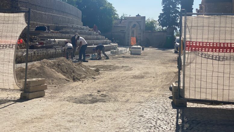 Seppur c’è stata qualche polemica sull’intervento da parte di alcune associazioni, si procede con i lavori finanziati con fondi del Pnrr. La gradinata è da circa 400 posti davanti alla Porta Santa di Collemaggio. Sarà stabile. Una sorta di piccolo anfiteatro all’aperto.