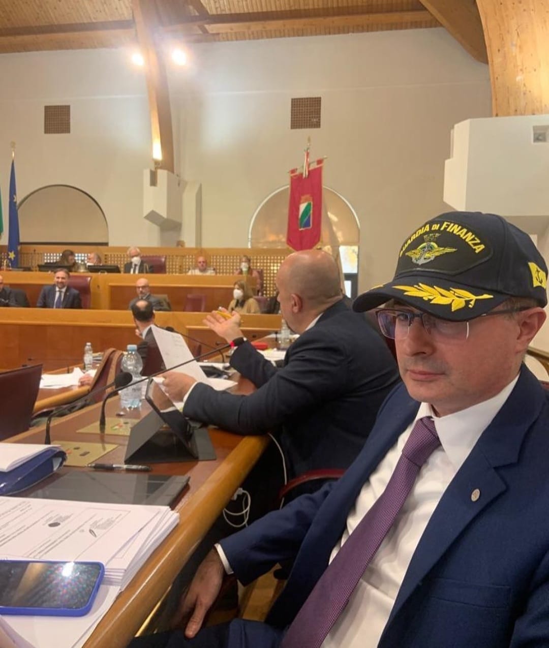 “Dopo ore di ostruzionismo sono stato costretto ad indossare un cappello della Benemerita Guardia di Finanza in aula, munito di megafono per non farci togliere la parola. Il nostro costruzionismo non arretrerà di un millimetro. Avanti senza mollare!”. Così il consigliere regionale del Movimento 5 Stelle Domenico Pettinari con tanto di berretto della Finanza, come vedete in foto, in forma di protesta