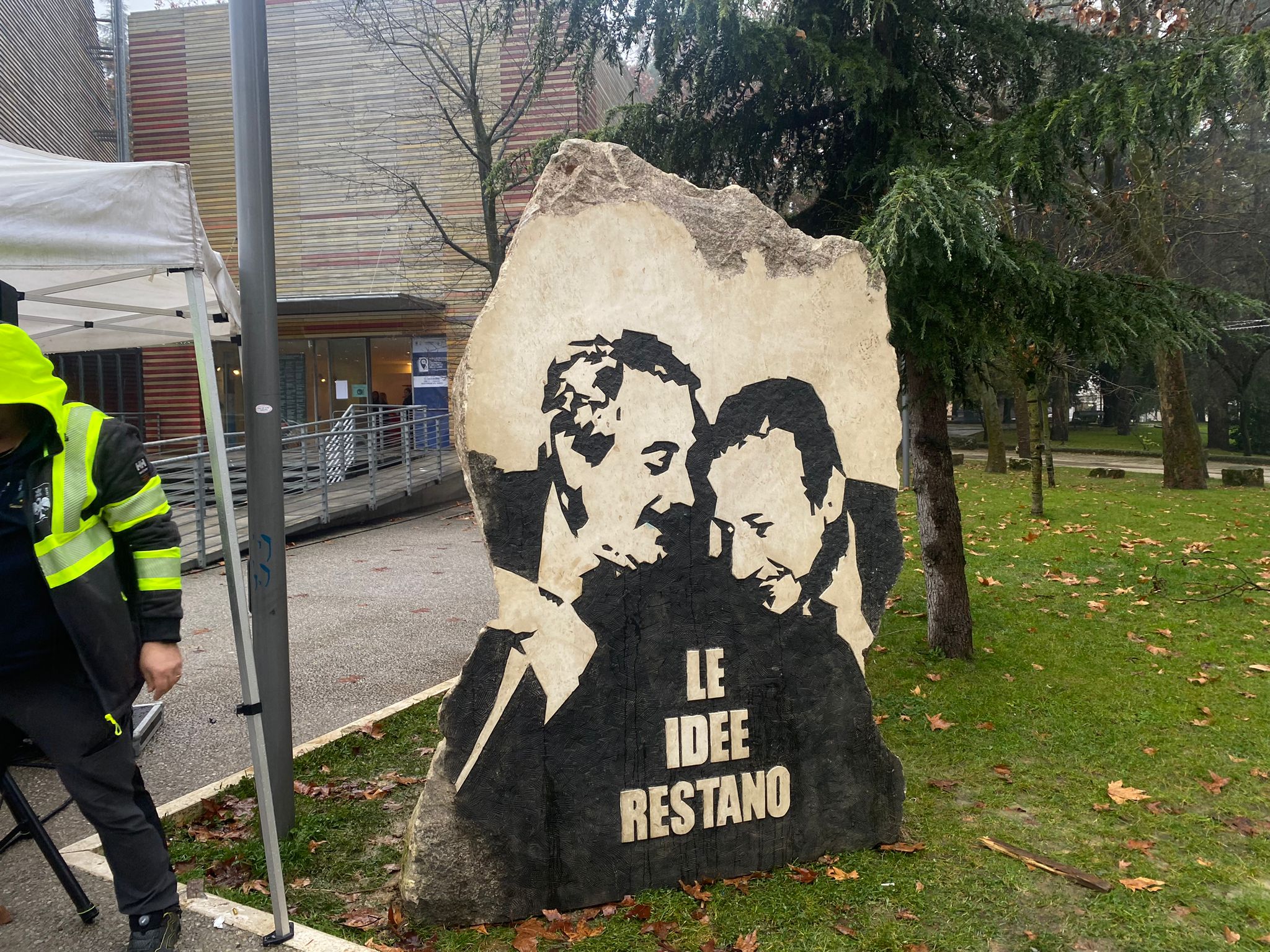 Una pietra della Maiella scolpita con i volti sorridenti dei magistrati, vittime di mafia, Giovanni Falcone e Paolo Borsellino degli studenti