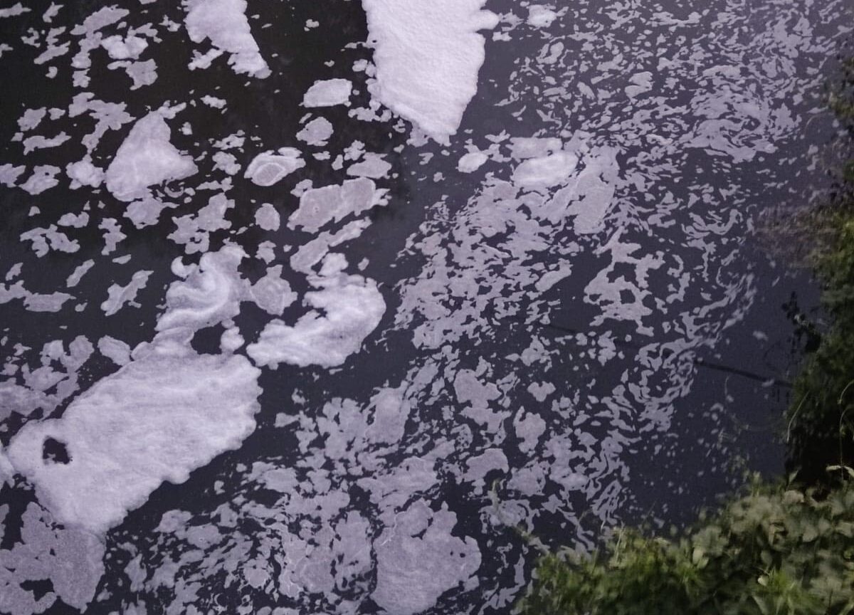 Schiuma bianca e acque maleodoranti nel fiume Aterno, nel tratto tra Onna e Monticchio dove si trova il ponte.