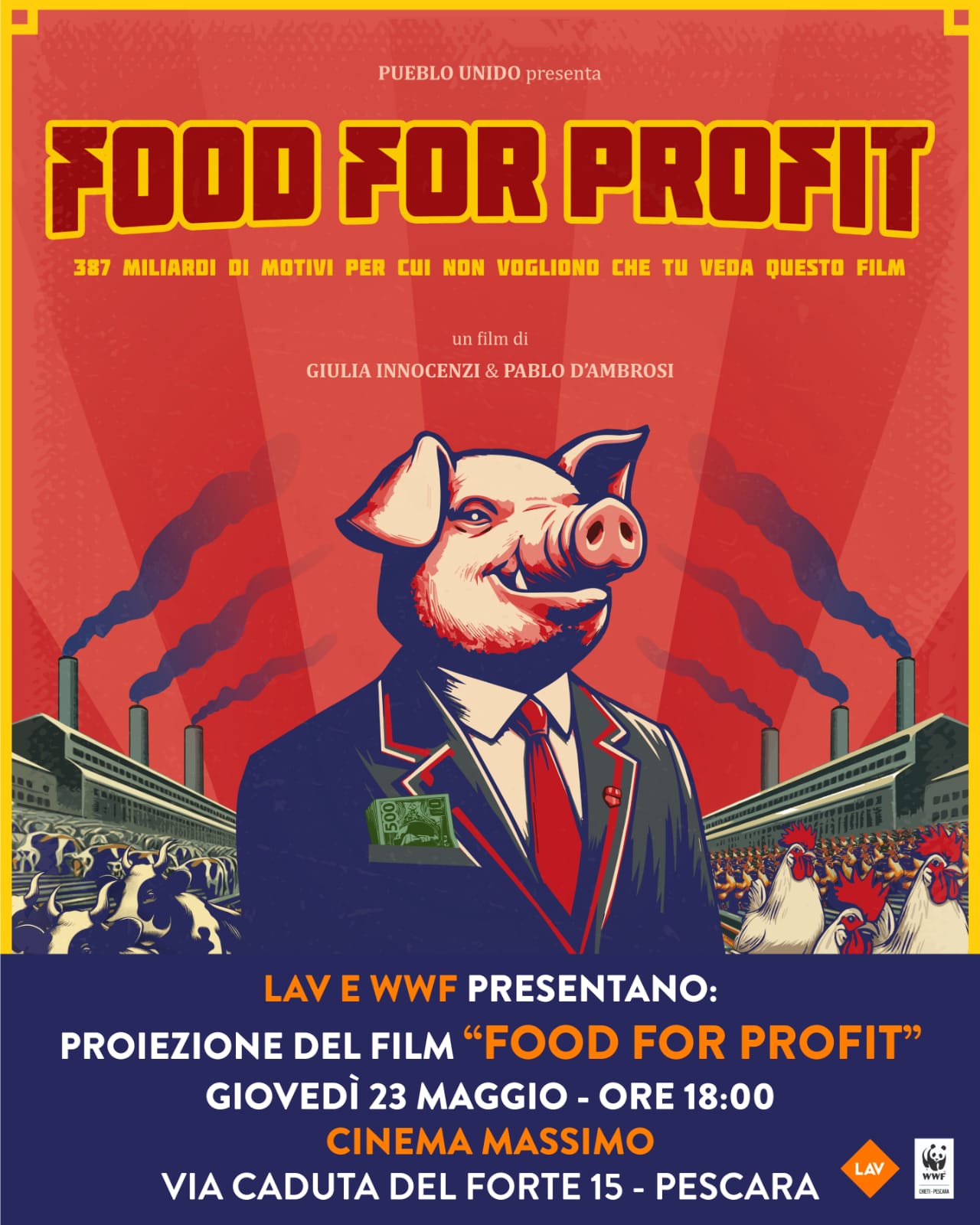 Iniziativa congiunta di LAV Pescara e WWF Chieti-Pescara: domani, al cinema Massimo di Pescara, con inizio alle 18, sarà proiettato “Food for Profit”, un documentario di Giulia Innocenzi e Pablo D’Ambrosi sulle crudeltà e gli impatti ambientali degli allevamenti intensivi e le connessioni tra industria della carne, lobby e potere politico.
