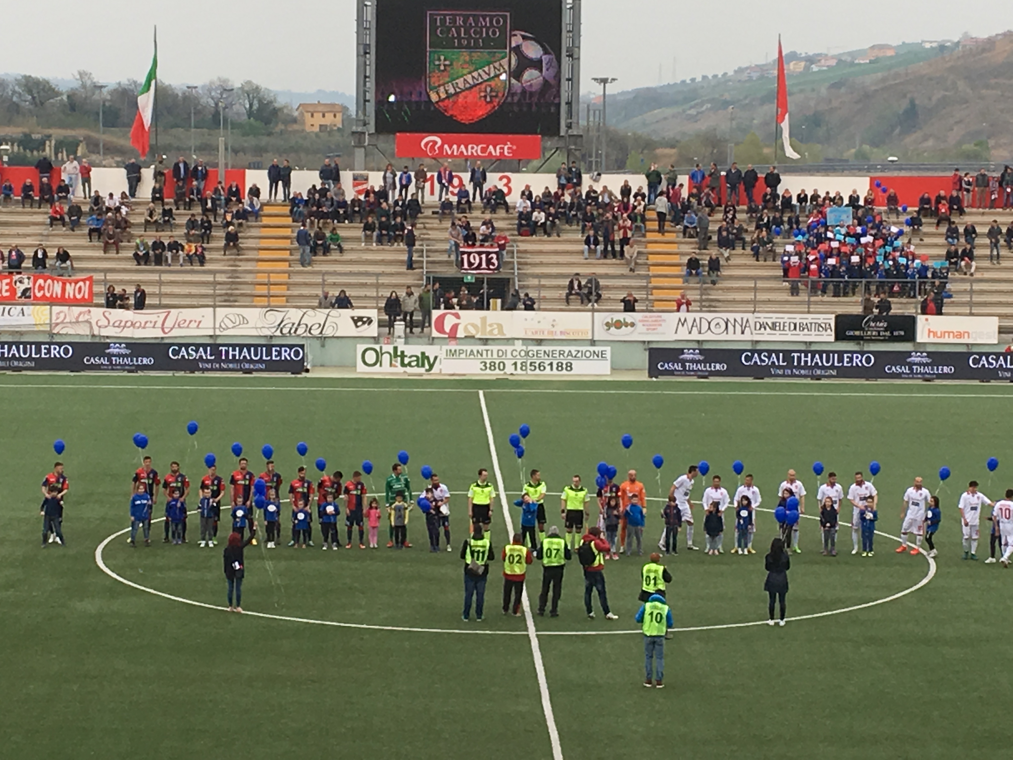 Davanti a oltre 2600 spettatori paganti di scena il ” quasi derby” tra Teramo e Sambenedettese. Finisce 2-1 con gol di Fratangelo , Bacinovic e Speranza. Ugolotti sceglie Fratangelo per Tempesti nell’11 iniziale, 4-4-2 il sistema di gioco. Sanderra nel suo 4-3-3 sceglie Di Massimo e Mancuso al fianco di Sorrentino. In difesa l’ex l’Aquila Rapisarda. Dirige Mastrodonato di Molfetta. Ritmi alti ma poche emozioni nel primo tempo. Di Massimo al 5′ controlla bene e prova il destro a giro. Palla out non di molto. La reazione del Teramo produce la più limpida delle palle gol ma Speranza da due passi di testa manda incredibilmente a lato. La cornice di pubblico è da categoria superiore, nella curva del Teramo cori contro il presidente Campitelli gelati dagli applausi della tribuna. Fratangelo alla mezz’ora decide di mettere tutti d’accordo e sono applausi scroscianti. Palla recuperata, trenta metri di corsa e sinistro perfetto. Sugli spalti il presidente Sebastiani e il ds del Pescara Leone prendono nota. Ripresa. Amadio impegna da lontano aridità poi arriva il pari rossoblu : da azione d’angolo Mancuso pesca Bacinovic, l’ex Lanciano fulmina Narciso. I ritmi restano alti, Sansovini di testa fa un piccolo capolavoro ma la dea è fin troppo bendata e la palla si stampa sulla traversa. Entrambe le squadre vogliono i tre punti, Lulli ci prova con un sinistro debole bloccato da Narciso poi nel finale girandola di sostituzioni e fucilata di Ilari bloccata da Aridità. L’ex Santarcangelo ha la colpa di aver calciato troppo bene il pallone. Ci prova anche Mancuso a fare il numero davanti a Daniele Sebastiani ma al 44′ il suo destro in bello stile non trova la porta. E quando stanno scorrendo i titoli di coda arriva il gol che regala la….Speranza per la salvezza diretta. Da azione d’angolo il capitano è il più lesto di tutti e supera Aridità. Esplode la festa, e gli applausi sono per tutti.