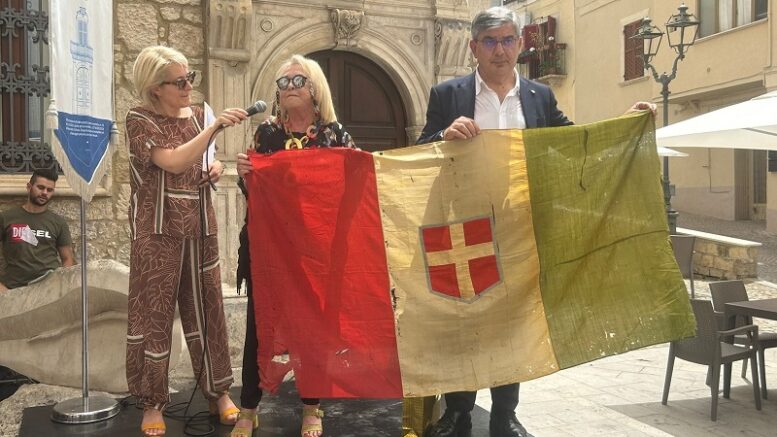 La prof.ssa Paola De Sanctis Ricciardone, discendente della famiglia gentilizia che fece costruire palazzo De Sanctis a Lettomanoppello, ha consegnato nelle mani dell’on. Luciano D’Alfonso la bandiera dell’Italia cucita dalla sua prozia Dorinda De Sanctis in occasione della visita a Chieti del re Vittorio Emanuele II il 18 ottobre 1860.