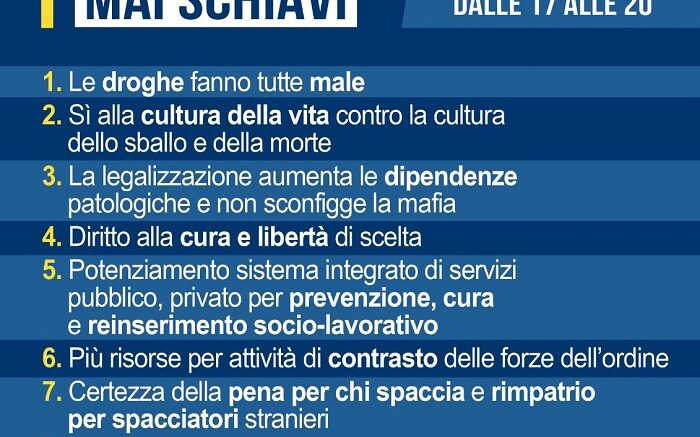 In occasione della Giornata mondiale contro la droga, il 26 giugno, iniziative anche in provincia di Chieti di Fratelli d’Italia per la “vita libera dagli stupefacenti e da ogni forma di dipendenza patologica, senza se e senza ma, a difesa della vita e della libertà”.
