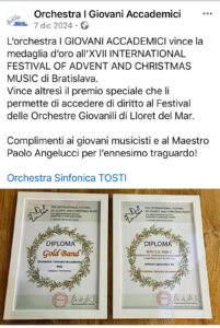 Il 9 settembre si esibiranno alle feste patronali di Abbateggio , col ricavato della serata acquisteranno le t-shirt che indosseranno a Barcellona.L’orchestra h vinto il Gran Premio del Concorso CHORUS INSIDE a Chieti. Nel 2017 ha vinto la medaglia d’oro al BOHEMIAN YOUNG MUSIC FESTIVAL di Praga. Nel 2022 ha ottenuto la medaglia d’oro al FESTIVAL DELLA MUSICA GIOVANI a Bratislava. Nel 2024 ha vinto il primo premio ed è stata riconosciuta come miglior orchestra al prestigioso concorso internazionale LASZLO SPEZZAFERRI di Verona. Inoltre, nel 2024, l’orchestra ha ottenuto un punteggio complessivo di 100/100 al Premio Anxanum di Lanciano (Ch) e ha vinto il concorso nazionale ORTONA CITTA’ D’ARTE – LIONS CLUB di Ortona (Ch), ricevendo i premi speciali Fedele Fenaroli e F. P. Tosti.Presentata l’Orchestra i Giovani Accademici.