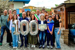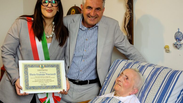 Una giornata di festa a Loreto Aprutino per i 100 anni di Maria Giuseppe Panciarelli, vedova di un soldato caduto nella Seconda Guerra mondiale, nata il 5 maggio del 1924 proprio nella cittadina vestina. Coccolata dal calore dei suoi familiari, in particolare della figlia Cecilia, del genero Lino, dei nipoti Ettore e Margherita e della pronipote Cristina, Maria ha ricevuto nel pomeriggio la visita dell’amministrazione comunale, con il sindaco Renato Mariotti in testa e l’assessore al Sociale, Geraldine Ferri.