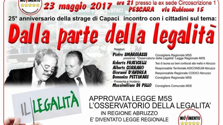 M5S Pescara, Falcone 25 anni dopo. “23 Maggio 1992 – 23 Maggio 2017 dalla Parte della Legalità”. IL M5S Pescara organizza una serata sulla legalità in memoria della strage di Capaci, per presentare l’Osservatorio sulla Legalità in Regione Abruzzo.