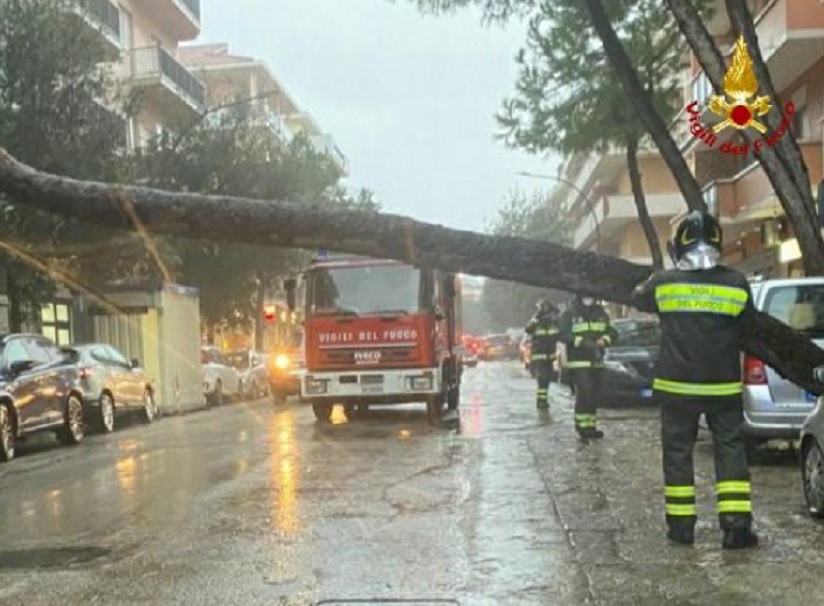 A Pescara piogge abbondanti e forti sferzate di vento con alberi caduti anche in pieno centro, come in via Cesare Battisti e in viale Muzii (angolo con viale Kennedy), dove i vigili del fuoco sono al lavoro per transennare l’area e rimettere in sicurezza l’intera zona. Palme sradicate dalla forza del vento anche lungo la riviera.