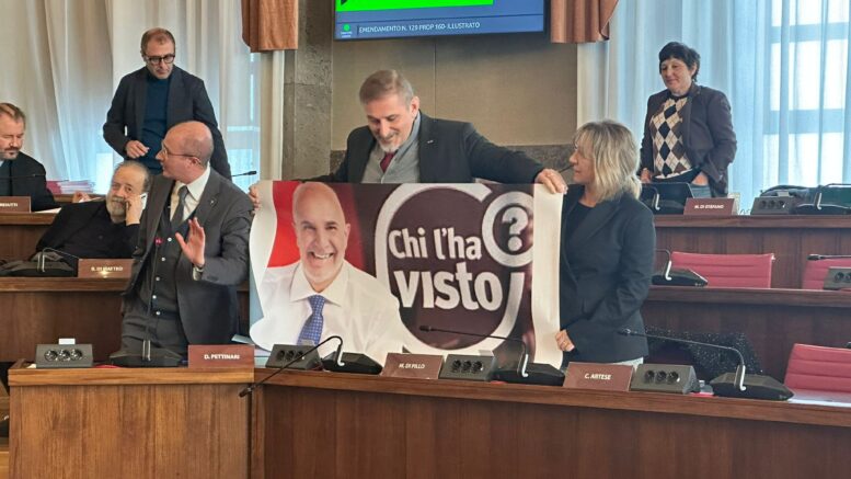 Pettinari che ha poi allertato anche la Digos perché gli agenti della Polizia Municipale gli hanno sequestrato lo striscione. L’Assessore al Bilancio Eugenio Seccia, approfittando di una sospensione concordata tra l’altra parte dell’opposizione e la maggioranza su un ordine del giorno presentato da Donato Di Matteo, assicura che non ci sarà nessun emendamento “tagliola”, ma dalla minoranza si attende contributi ragionevoli e non strumentali, come quello sulla sede della Regione nell’Area di Risulta, decisione sulla quale non sarà possibile fare passi in dietro: