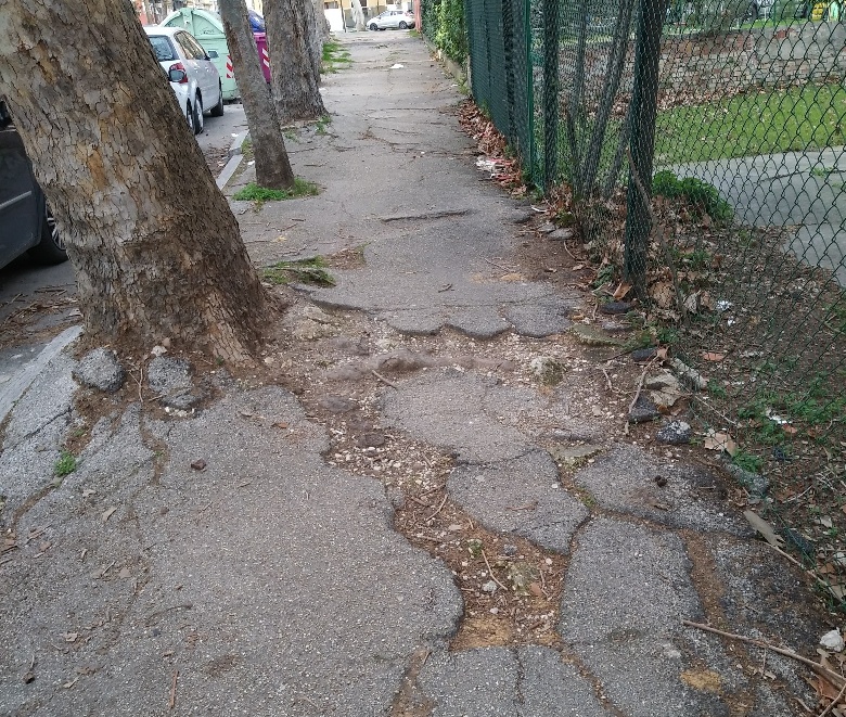 Vi allego due foto di situazioni urbane centrali nel totale degrado diventate pericolose, per pedoni ed automobilisti ed abbandonate all’incuria da parte dell’Amministrazione. Il marciapiede di via Coppa Zuccari rappresentato conduce al Liceo Marconi frequentato da più di mille studenti (foto in evidenza).