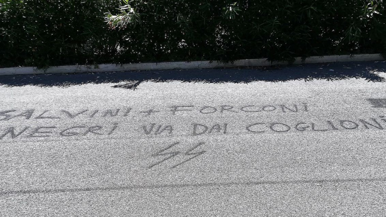 Scritta razzista sulla Strada parco, a Montesilvano. Del fatto si stanno interessando i Carabinieri della locale Compagnia, che hanno subito informato il sindaco, Francesco Maragno, affinché il Comune provveda all’immediata rimozione.