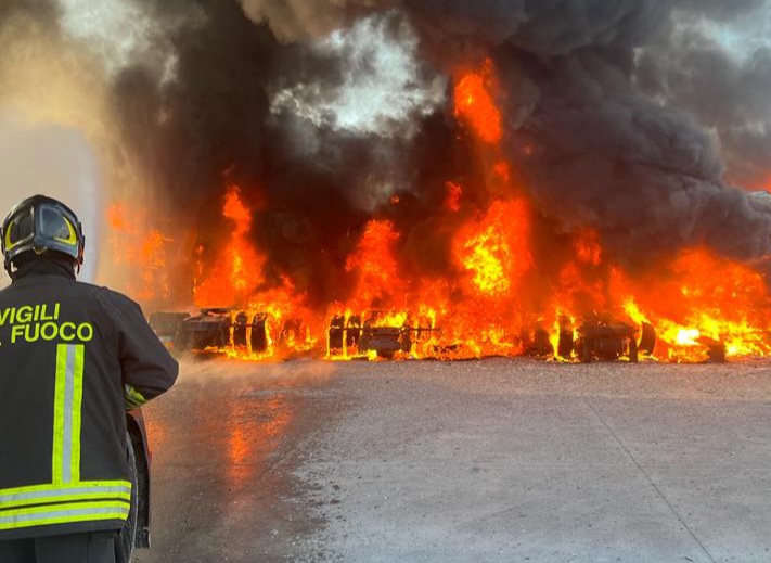 Due squadre dei vigili del fuoco del Comando di Teramo e del Distaccamento di Roseto degli Abruzzi, con sei automezzi operativi e un’autobotte inviata sul posto dal Comando dell’Aquila, sono intervenute presso una ditta di autotrasporti di Montorio al Vomano a seguito dell’incendio di alcuni camion. Le fiamme sono partite dalla motrice di un autoarticolato in sosta nel piazzale e si sono propagate ad altre otto motrici che sono state avvolte dalle fiamme. In pochissimo tempo si è sviluppata una colonna di fumo visibile a notevole distanza. I vigili del fuoco hanno utilizzato potenti getti di acqua e di schiuma posizionandosi ad una distanza adeguata per proteggersi dal forte calore. Le fiamme sono state alimentate anche dal gasolio contenuto nei serbatoi dei mezzi pesanti. Il notevole calore prodotto dall’incendio ha provocato danni anche ad altre due motrici e ad un’autovettura in sosta nelle vicinanze. Sul posto si è recato il Sindaco di Montorio e sono intervenuti anche l’ARTA e i Carabinieri di Teramo e Montorio al Vomano per gli adempimenti di competenza. Nel tentativo di allontanare i camion che rischiavano di essere raggiunti dalle fiamme, il titolare della ditta ha riportato leggere ustioni al capo e agli arti ed è stato trasportato in ambulanza presso l’ospedale di Teramo insieme ad un vigile del fuoco che ha subito una distorsione al ginocchio.