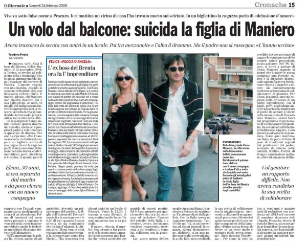 Era il febbraio del 2006 quando Elena, figlia di Felice Maniero, storico boss della “Mala del Brenta”, già da molti anni residente, sotto mentite spoglie, tra Pescara e Spoltore, volò dalla finestra della mansarda di una palazzina di Via Carducci. Una splendida ragazza che decide di farla finita, così, all’improvviso, si é detto sia stato a causa di una forte delusione d’amore, ma in qualche modo anche lo stress di dover vivere nell’incognito, tanto che il caso fu archiviato dalla Procura di Pescara, come suicidio. I dubbi sono rimasti in gran parte dell’opinione pubblica, soprattutto alla luce del burrascoso passato di suo padre, ed ora a distanza di quasi un decennio le rivelazioni choc di Giancarlo Carpi, rilasciate ad un giornalista di Report e che andranno in onda domenica prossima su Rai3. Elena Maniero fu, come si dice in gergo, “suicidata”, indotta al suicidio, o peggio ancora lanciata letteralmente dalla finestra, per vendetta nei confronti del padre che da anni aveva deciso di collaborare con la giustizia. Giancarlo Carpi é un personaggio molto noto nel mondo della malavita per aver fondato negli anni ’90 la “Legione Brenno”, una sorta di organizzazione militare “parallela” che fortunatamente non ebbe lunga vita, ma che comunque si segnalò per una vicenda legata al traffico internazionale di armi. Partecipò segretamente alla guerra dei Balcani come mercenario e finì in carcere a Padova dove intrecciò rapporti con altri personaggi della criminalità, in particolare del Veneto, fu lì – stando a quanto ha riferito nell’intervista – che gli venne confidato che di lì a poco avrebbero, in qualche modo, ucciso la figlia di Maniero, e così fu.