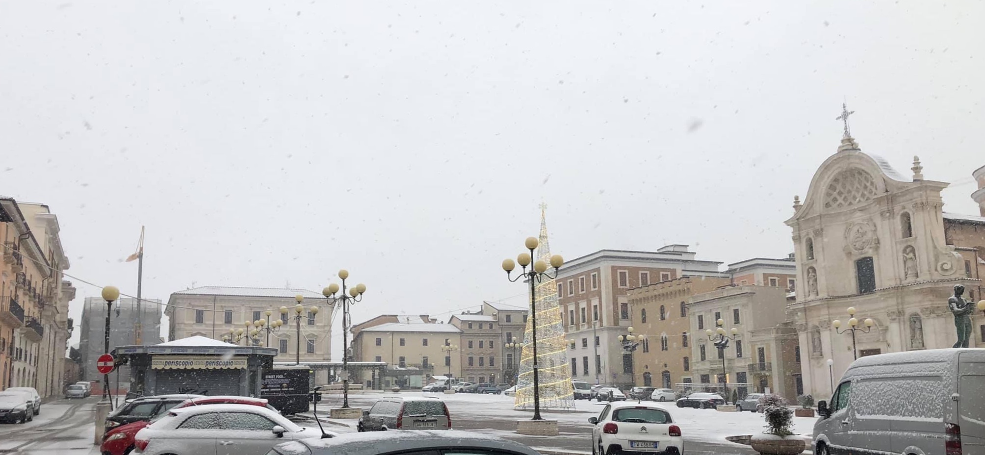 Non ha imbiancato monumenti e piazze a Natale ma la neve all’Aquila è arrivata almeno per l’Epifania nel giorno in cui, paradossalmente, dopo più di 70 anni salta per la prima volta la tradizionale fiera della Befana della vigilia della festa alla quale gli aquilani sono tanto legati, tutto a causa del Covid.