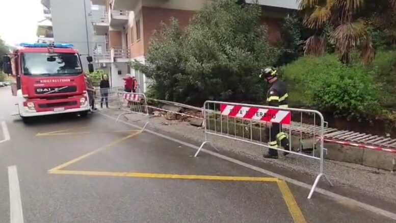 Il maltempo ha provocato diversi smottamenti: in via Flaiani un cedimento ha fatto crollare un muretto e la recinzione di una palazzina, finita contro alcune auto parcheggiate. Ancora più esteso il fronte franoso in via Fonte della Noce, a Porta Madonna, dove fango e detriti hanno raggiunto il torrente Vezzola. Cedimenti anche a Porta Melatina, dove l’asfalto ha ceduto in una zona di sosta.
