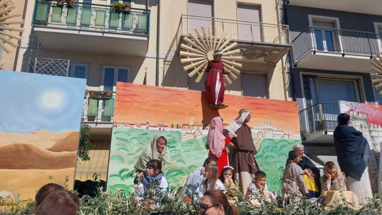 Questa volta: “La Terra Promessa” un invito a dire no a tutte le guerre e ai Popoli di avere il diritto di vivere su questa terra. I carri sono trainati da trattori tranne il settimo, portato a spalla, che richiama la tradizione più antica tra fede e tradizione. Tutto qiesto con la colonna sonora della banda e l’intera comunità di Orsogna che ritrova il suo rito. E non sono pochi i cittadini stranieri che chiedono di partecipare al corteo. Quadri sapientemente realizzati per rappresentare e raccontare episodi presenti nella Bibbia. La presidente dell’Associazione Talami Livia Ceccarossi precisa che, appena conclusa la manifestazione odierna, già la cittadinanza si prepara per il prossimo anno. Diversi anche gli Abruzzesi all’estero che tornano per l’occasione.