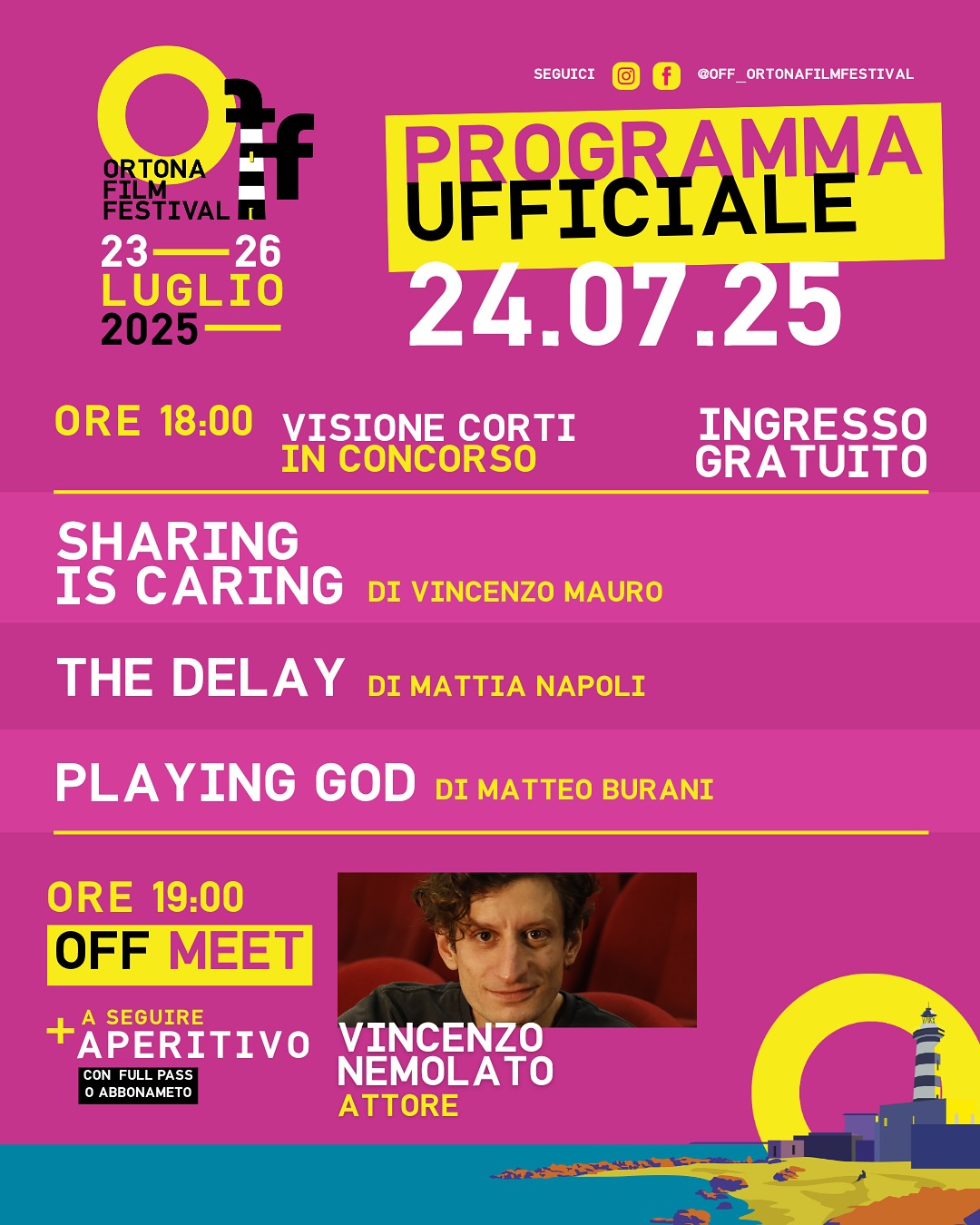 L’Ortona Film Festival (OFF) entra nel vivo del programma: la seconda giornata ufficiale di festival prevista per domani giovedì 24 luglio prenderà il via alle ore 18:00 al Cinema Zambra di Ortona dove il pubblico avrà l’occasione di esplorare nuove prospettive cinematografiche gratuitamente attraverso la proiezione di tre cortometraggi d’autore, al fianco di una giuria dedicata: si tratta di “Sharing is Caring”, “The Delay” e “Playing God”