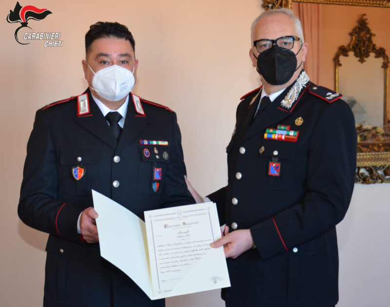 Nella scorsa mattinata presso la caserma “Pasquale Infelisi” di Chieti, sede del Comando Legione Carabinieri “Abruzzo e Molise”, il Comandante, Generale di Brigata Paolo Aceto, nel corso di una sobria cerimonia a causa delle restrizioni imposte dall’attuale pandemia, ha consegnato al Maresciallo Antonio Verì, in servizio presso la Stazione dei Carabinieri di Ortona, l’encomio solenne, come prima attestazione di merito, concesso dal Comandante Generale dell’Arma dei Carabinieri Generale di Corpo d’Armata Teo Luzi con la seguente motivazione: “Addetto a Stazione Carabinieri, con ferma determinazione, generoso altruismo ed eccezionale senso di abnegazione, non esitava, insieme con altro militare, ad estrarre con estrema difficoltà dall’abitacolo di un’autovettura alimentata a gpl e avvolta dalle fiamme, un uomo che aveva tentato il suicidio, traendolo in salvo. Chiaro esempio di elette virtù civiche ed altissimo senso del dovere.” L’evento per il quale è stato tributato l’importante riconoscimento risale al 23 aprile 2021 quando in agro di Ortona alcuni passanti segnalarono al 112 la presenza di un uomo in evidente stato di alterazione. Sul posto intervenne la pattuglia della stazione dei carabinieri di Ortona composta dai marescialli Antonio Verì ed Eleonora Marziello. I due operanti rintracciarono celermente la Fiat Panda segnalata dal cui abitacolo, benché avesse le portiere ed i finestrini chiusi, fuoriusciva un denso fumo e si intravedevano le prime fiamme. Sul sedile lato guida scorgevano, esamine, l’aspirante suicida.