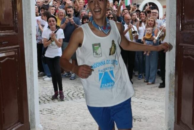 I 26 partecipanti, rigorosamente a piedi nudi, si sono lanciati lungo un sentiero impervio, affrontando sassi e rovi dalla Pietra Spaccata fino al fiume Vella, per poi risalire le vie del borgo. Tra di loro, 25 erano di Pacentro (di cui uno residente in Venezuela) e uno di Corfinio. Il più anziano 62 anni, il più giovane 14. Il veterano Massimo Saccoccia, alla sua 26ª partecipazione, si è classificato al quarto posto. La fatica e il dolore si sono uniti alla devozione nel momento dell’arrivo, dove i concorrenti, con i piedi sanguinanti, sono stati accolti da un’equipe medica e dall’abbraccio della folla. A vincere questa indimenticabile edizione è stato Andrea Paletta, 15 anni, di Pacentro, che ha dedicato la vittoria al nonno scomparso e ha ricevuto il “Palio”, una pregiata stoffa che un tempo serviva per cucire “il vestito buono”. Andrea fa parte di una famiglia che partecipa alla Corsa da generazioni, ma è il primo a vincerla. Per prepararsi al meglio, ha raccontato di essersi allenato a camminare scalzo da marzo. Il secondo e il terzo posto sono andati ai cugini Simone ed Eliseo Ultimo, portati in trionfo a spalla tra la folla assieme al vincitore, un’immagine potente di orgoglio e senso di appartenenza a questa terra.