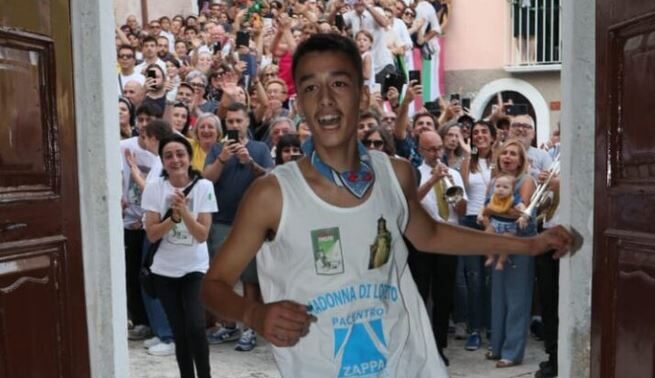 I 26 partecipanti, rigorosamente a piedi nudi, si sono lanciati lungo un sentiero impervio, affrontando sassi e rovi dalla Pietra Spaccata fino al fiume Vella, per poi risalire le vie del borgo. Tra di loro, 25 erano di Pacentro (di cui uno residente in Venezuela) e uno di Corfinio. Il più anziano 62 anni, il più giovane 14. Il veterano Massimo Saccoccia, alla sua 26ª partecipazione, si è classificato al quarto posto. La fatica e il dolore si sono uniti alla devozione nel momento dell’arrivo, dove i concorrenti, con i piedi sanguinanti, sono stati accolti da un’equipe medica e dall’abbraccio della folla. A vincere questa indimenticabile edizione è stato Andrea Paletta, 15 anni, di Pacentro, che ha dedicato la vittoria al nonno scomparso e ha ricevuto il “Palio”, una pregiata stoffa che un tempo serviva per cucire “il vestito buono”. Andrea fa parte di una famiglia che partecipa alla Corsa da generazioni, ma è il primo a vincerla. Per prepararsi al meglio, ha raccontato di essersi allenato a camminare scalzo da marzo. Il secondo e il terzo posto sono andati ai cugini Simone ed Eliseo Ultimo, portati in trionfo a spalla tra la folla assieme al vincitore, un’immagine potente di orgoglio e senso di appartenenza a questa terra.