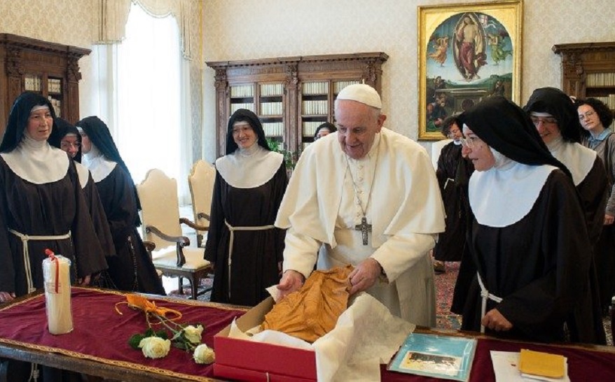 Nell’incontrarle, il Papa consegna il testo del suo discorso e ringrazia della preghiera costante e del cero pasquale per la Cappella di Casa Santa Marta, decorato dalle loro preziose mani. Le suore clarisse sono rientrate nel monastero di Paganica, dopo dieci anni dal sisma.