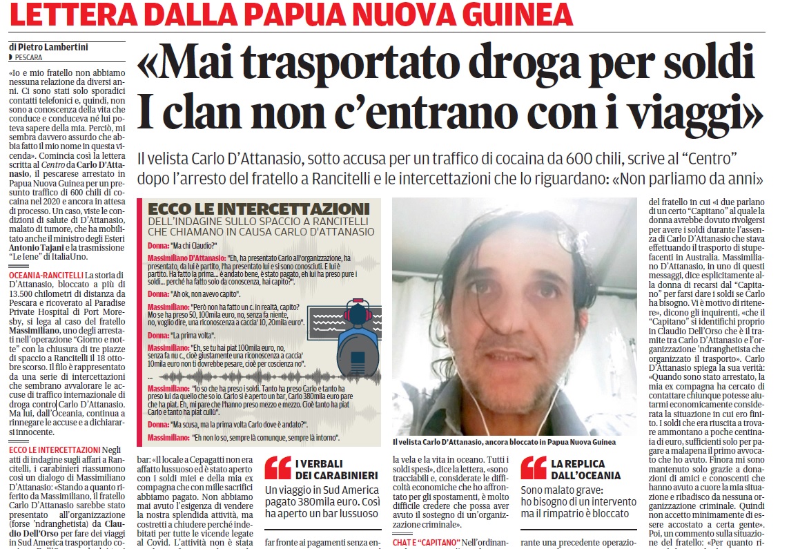ll velista Carlo D’Attanasio, sotto accusa per presunto un traffico di cocaina da 600 chili e arrestato in Papua Nuova Guinea, scrive al quotidiano Il Centro, dopo l’arresto del fratello a Rancitelli e le intercettazioni che lo riguardano