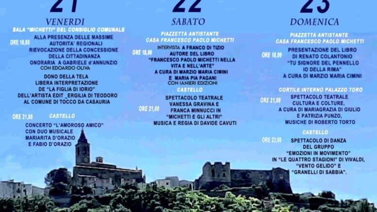Tre pomeriggi di arte e cultura (21-23 luglio 2023) a Tocco da Casauria, paese che diede i natali a Francesco Paolo Michetti: tre giornate per riscoprire il profondo legame artistico e umano tra il pittore toccolano e Gabriele d’Annunzio, un’amicizia da cui nacquero opere straordinarie come La figlia di Jorio (il celebre dipinto vincitore alla Biennale di Venezia, il cui soggetto ispiro l’omonimo dramma d’Annunziano).