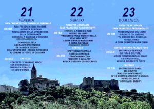 Domenica 23 luglio, alle ore 18, nella piazzetta antistante casa Michetti, la presentazione del libro di Renato Colantonio “Tu signore del pennello, io della rima”, a cura di Marzio Maria Cimini. Alle 21, nel cortile interno di Palazzo Toro, spettacolo teatrale “Cultura e colture”, a cura di Mariagrazia Di Giulio e Patrizia Punzo, musiche di Roberto Torto. Alle ore 23 al Castello lo spettacolo di danza del gruppo Emozioni in movimento. Saranno eseguite performance su musiche da “Le quattro stagioni” di Vivaldi, “Vento gelido” e “Granelli di sabbia”.