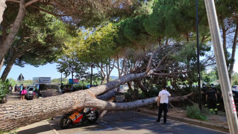 La zona è stata totalmente transennata e chiusa al traffico. Il pino è finito sulla carreggiata colpendo un’auto e alcune moto lì parcheggiate. Non ci sono persone coinvolte.