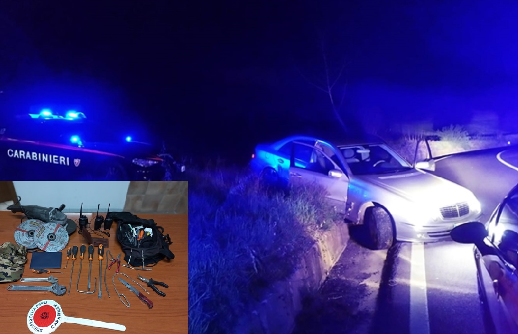 I militari insospettiti dalle circostanze hanno inseguito l’automobile che, noncurante dell’alt imposto, si dava alla fuga per le strade cittadine, fino ad imboccare una strada interpoderale adiacente alla SS 81 in località Cortile, che costringeva i tre malviventi ad abbandonare l’auto e a darsi alla fuga a piedi tra i campi circostanti. All’interno dell’auto abbandonata è stato trovato uno zaino contenente numerosi arnesi da scasso, strumenti artigianali per l’apertura di porte e finestre, una smerigliatrice, tre radio ricetrasmittenti ed utensili modificati per la forzatura dei nottolini. L’auto utilizzata dai malviventi ed il materiale rinvenuto sono stati posti sottoposto sequestro in attesa di dare un nome ed un volto ai tre uomini sorpresi nella notte.