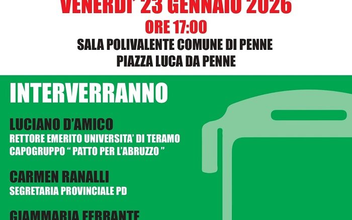 Interverranno Luciano D’Amico, rettore emerito dell’Università di Teramo e capogruppo “Patto per l’Abruzzo”, Carmen Ranalli segretaria provinciale del Partito Democratico, Giammaria Ferrante coordinatore FILT-CGIL Pescara TuaAbruzzo, e Angela Pizzi dirigente scolastico, modera Margherita D’Agostino Segretaria circolo Partito Democratico Penne.