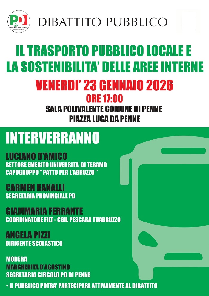 Le suddette e altre criticità del tpl nelle aree interne verranno approfondite in un dibattito pubblico che si terrà oggi presso la sala polivalente del comune di Penne in Piazza Luca da Penne alle ore 17.00. L’iniziativa si propone di avviare un confronto sulle criticità strutturali del sistema di mobilità nei territori interni e sulle possibili strategie per garantire servizi efficienti, accessibili e compatibili con gli obiettivi di sostenibilità ambientale e sociale.
