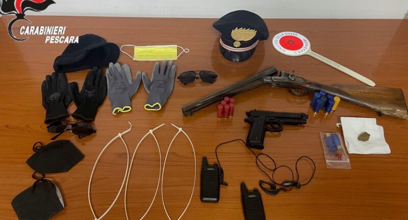 Le perquisizioni scattate a seguito dell’arresto, facevano emergere un quadro indiziario ancora più delicato: nelle pertinenze di uno degli arrestati si rinvenivano infatti un fucile calibro 12 a canne mozze illegalmente detenuto, perfettamente funzionante e con varie munizioni dello stesso calibro, 10 grammi di hashish e due stampe in plastica, palesemente contraffatte, raffiguranti le riproduzioni, anteriore e posteriore, di una targa fittizia, utilizzata per depistare i controlli durante altre attività criminali.