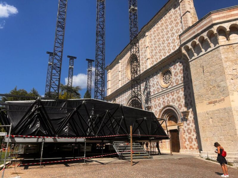 I cittadini per il centro storico hanno lanciato la petizione anche per “prevenire rischi di danneggiamento a causa delle vibrazioni”. In realtà sul palco le polemiche sono iniziate da anni, da quando si decise per la Perdonanza di trasformare il sagrato dinanzi alla basilica in una sorta del “teatro del perdono”, come lo ha chiamato il direttore artistico Leonardo De Amicis.