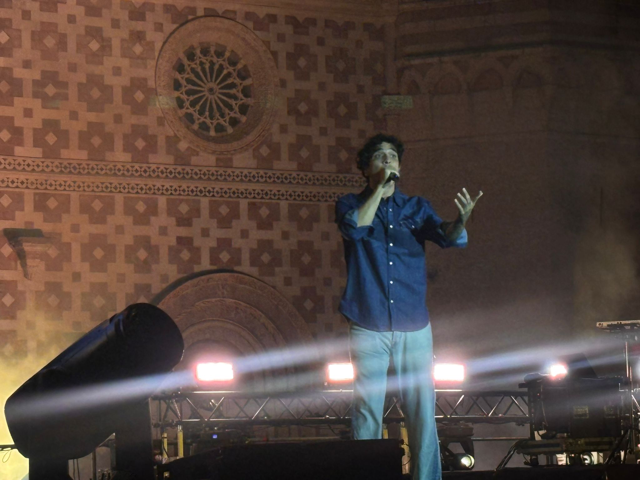 Tananai entra sul palco senza giri di parole, ciao L’Aquila si limita e dire e parte con uno dei più grandi successi Booster, poi ad un certo punto chiede di alzare le luci per vedere la gente e la splendida facciata di Collemaggio. Scende pure tra il pubblico.
