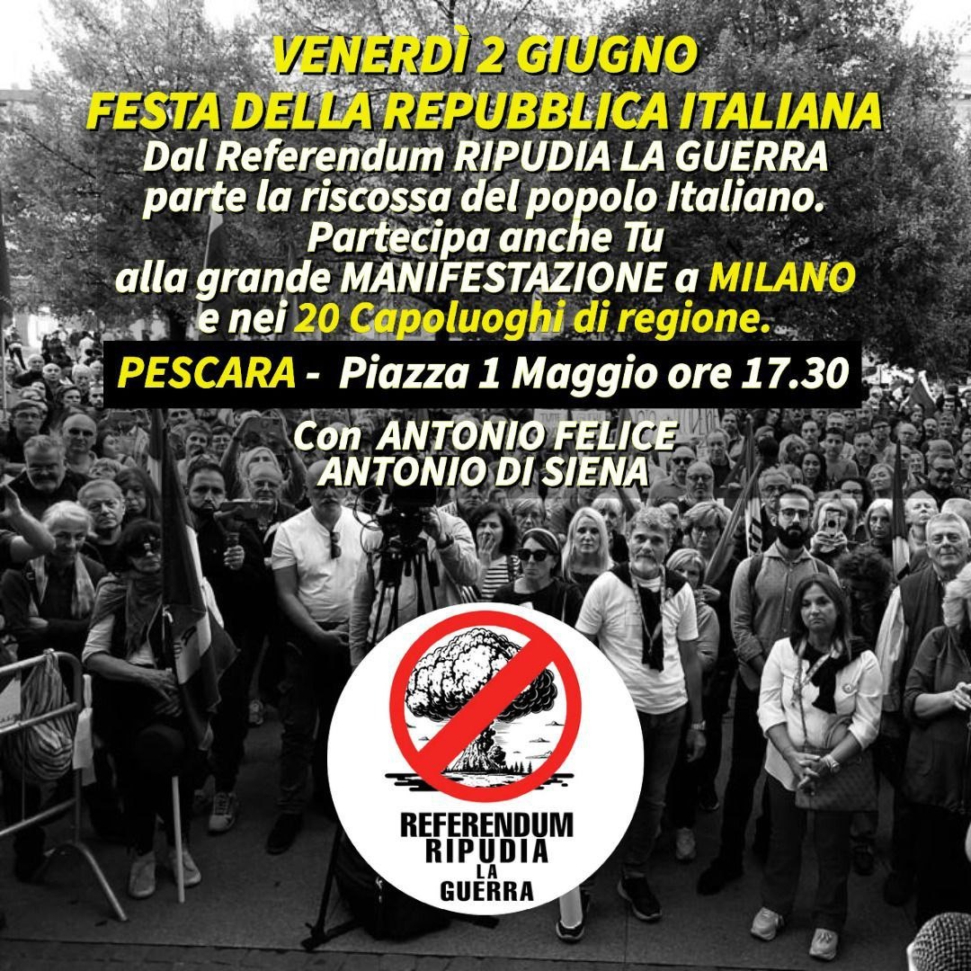 La pace è l’unica soluzione: questo il principio guida della manifestazione convocata dal comitato referendario “Ripudia la Guerra” per il 2 giugno, giorno della Festa della Repubblica. Appuntamento in 20 città, c’è anche Pescara