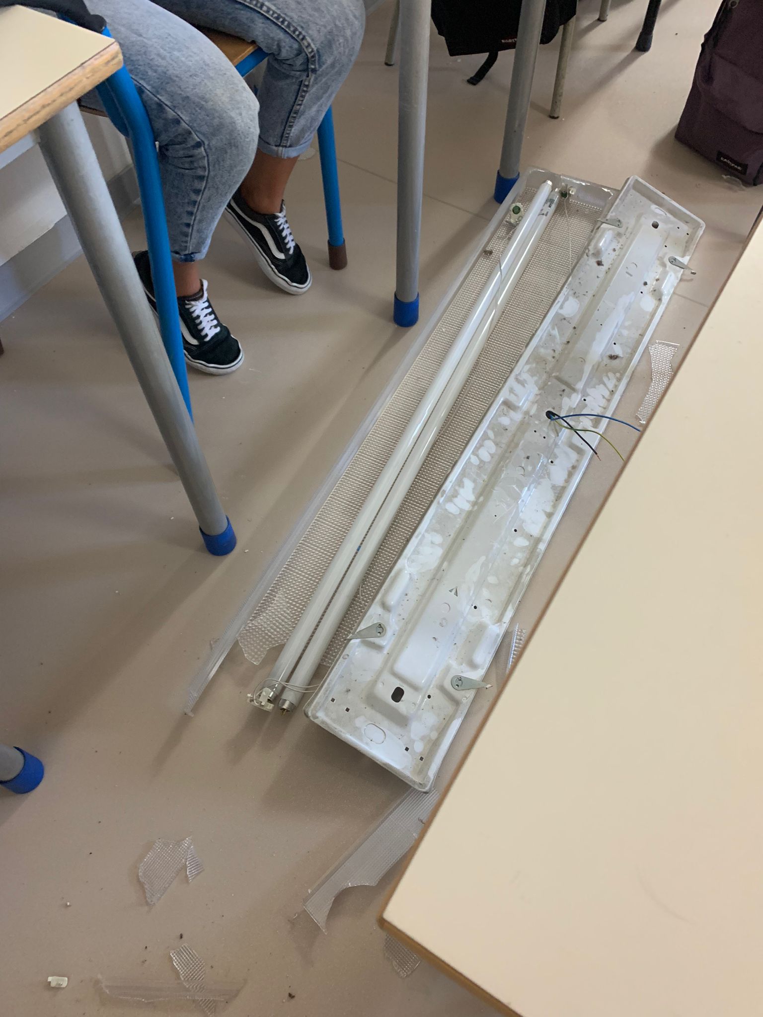 Pochi minuti dopo il ritorno in classe al “De Cecco” un neon si è staccato dal soffitto cadendo a terra mentre in aula c’erano già studenti e professori.
