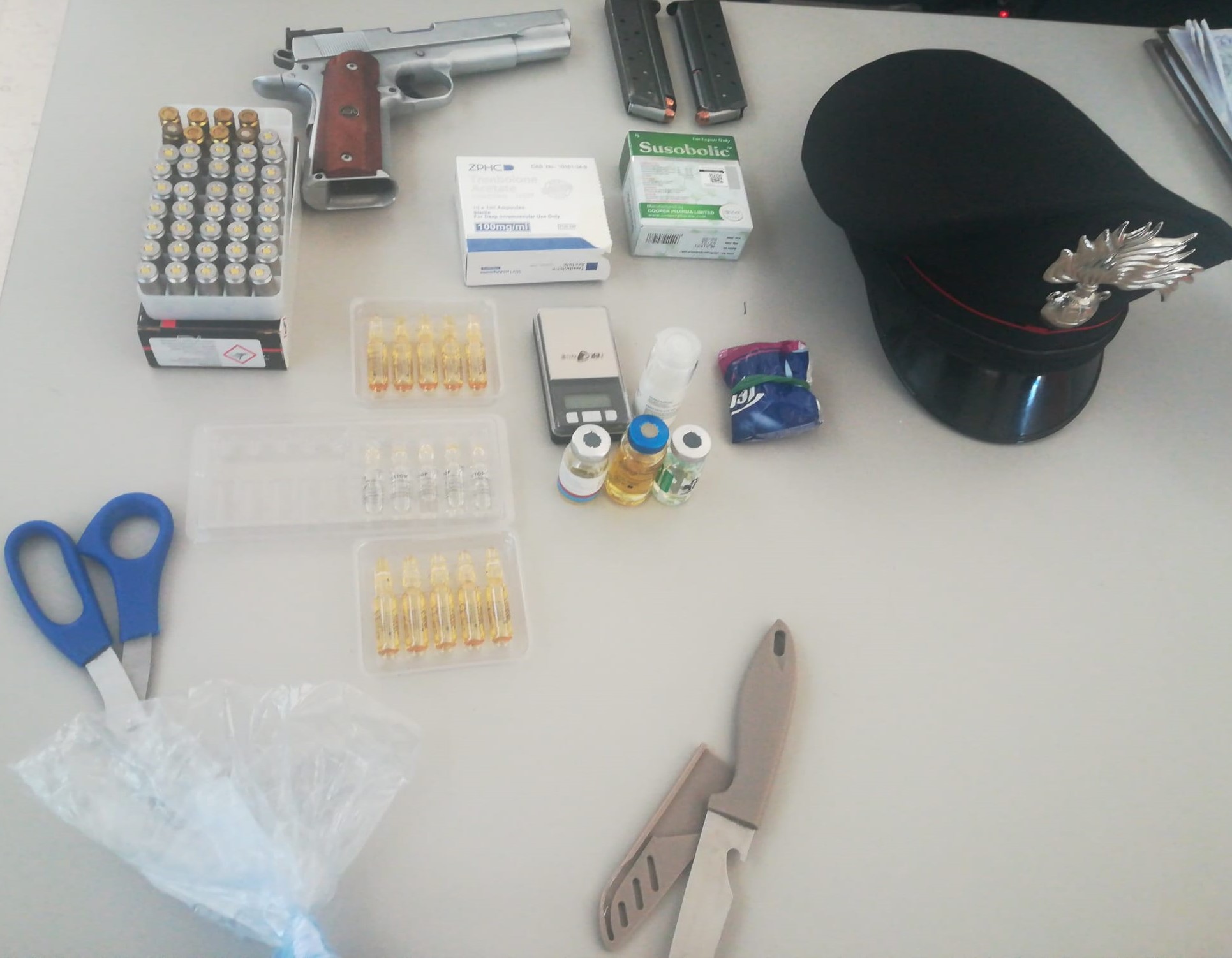 Durante le perquisizioni nelle abitazioni dei due arrestati i carabinieri hanno trovato e sequestro 160 grammi di cocaina, 15 fiale di steroidi anabolizzanti tra cui “nandrolone decanoate” e “testosterone”; una pistola “Colt Dallara Castom” calibro 10 e 58 cartucce