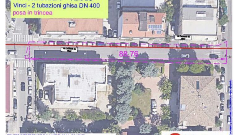 Da oggi i lavori, finanziati con fondi Pnrr (15 milioni di euro), interessano via Michelangelo e via Da Vinci, dove, entro il 30 luglio, saranno posate in trincea due tubazioni in ghisa DN 400. L’intervento procederà per fasi, il settore competente del Comune di Pescara ha disciplinato la viabilità con un’apposita ordinanza.