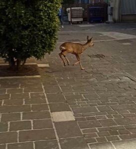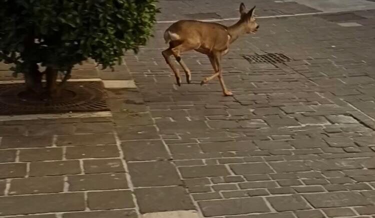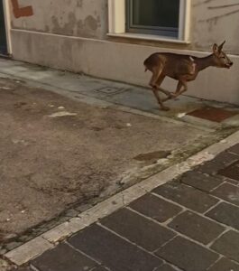 Capriolo al galoppo in pieno centro a Pescara, in via Roma. Spaventato da passanti e rumori si è ferito contro la vetrina di un bar andata in frantumi.