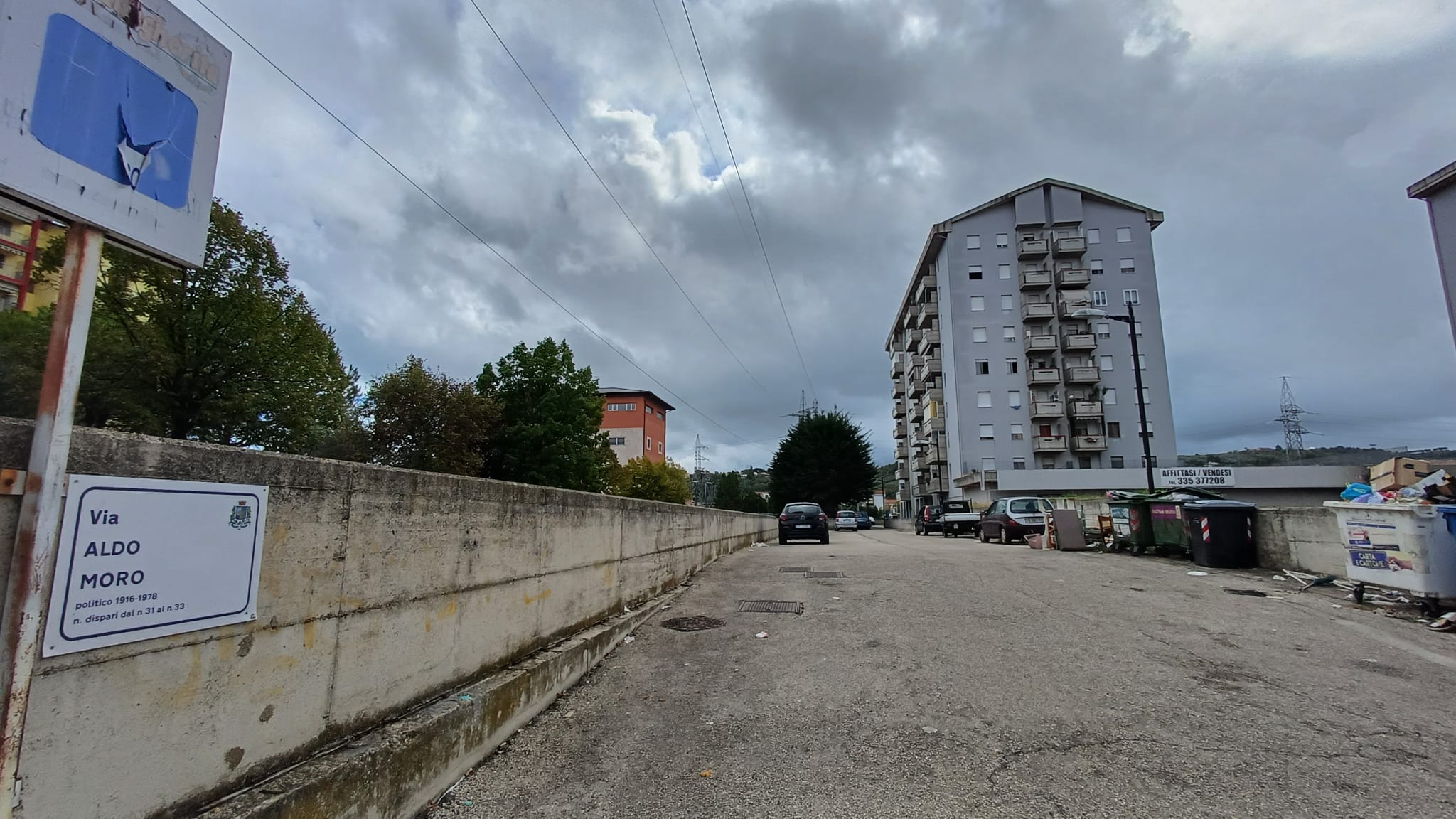 Via Aldo Moro è divisa in due dalla strada principale: da una parte vi sono le cooperative Aternum, case private, dall’altra i palazzoni popolari.
