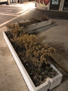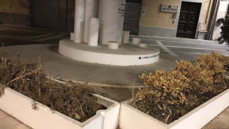 Secche e trasandate. Così si mostrano agli occhi di passanti e turisti le due fioriere in pietra ai piedi del monumento dedicato a Flaiano, in piazza Unione.