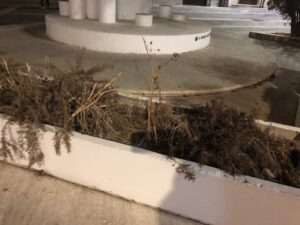 Secche e trasandate. Così si mostrano agli occhi di passanti e turisti le due fioriere in pietra ai piedi del monumento dedicato a Flaiano, in piazza Unione.