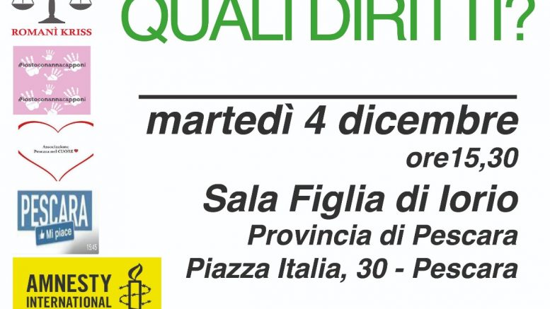 Il convegno, patrocinato dalla Provincia di Pescara,che svolgerà a ridosso della giornata internazionale dei diritti dell’uomo, sarà occasione per discutere dell’attuale tema dei diritti che sanciscono la dignità e l’inclusione anche della millenaria Popolazione Romanì presente in Abruzzo già dalla fine del 1300. Prenderanno parte al convegno Antonella Allegrino, Assessore alle politiche sociali di Pescara, Alessandra Genco consigliera regionale delle pari opportunità, Amnesty International, l’associazione Pescara mi piace e l’associazione Pescara nel cuore , il giornalista Luciano Troiano, l’attivista Adele Di Rocco, Anna Capponi e i legali Serena Gasperini, Bruno Gallo e Berardino Fiorilli.
