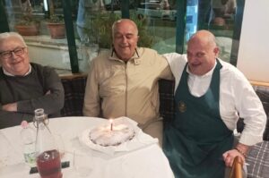 Pietro Di Bartolomeo (al centro) in una foto scattata l’8 maggio del 2024, per il suo compleanno, con gli amici Lamberto Quarta e Maurizio D’Anolfi.