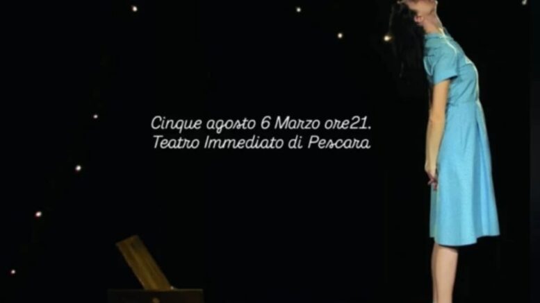 Venerdì 6 marzo, alle ore 21, il Teatro Immediato di Pescara (Via Nenni 3), diretto da Edoardo Oliva, ospita lo spettacolo Cinque Agosto scritto, diretto e interpretato da Serena Di Gregorio, finalista al Premio Scenario per Ustica 2013 e vincitrice del premio Abito in Scena di Potenza.