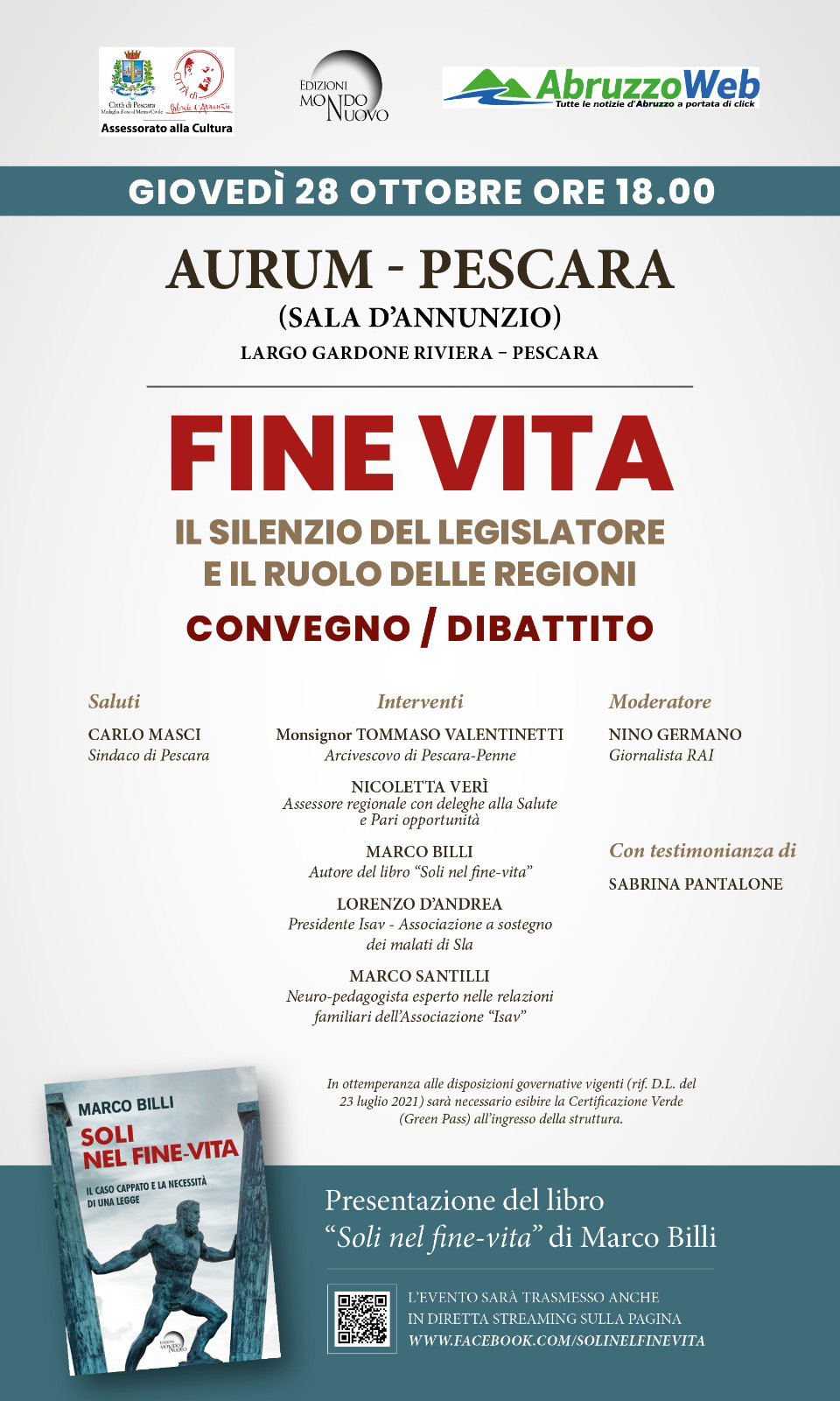 Dopo i saluti di Carlo Masci, sindaco di Pescara, sono previsti gli interventi di monsignor Tommaso Valentinetti, arcivescovo di Pescara-Penne, di Nicoletta Verì, assessore regionale alla sanità, Lorenzo D’Andrea, presidente dell’Associazione a sostegno dei malati di Sla (Isav) e Marco Santilli, neuro-pedagogista esperto nelle relazioni familiari dell’associazione Isav. Particolarmente significativa si annuncia la testimonianza di Sabrina Pantalone, affetta da sclerosi multipla. Tra i relatori anche il giudice del tribunale dell’Aquila Marco Billi autore del libro “Soli nel fine vita. Il caso Cappato e la necessità di una legge”, nel quale il magistrato denuncia il vuoto legislativo in Italia su questo delicato tema etico: una carenza che mette in serie difficoltà sia i cittadini sia gli stessi giudici.