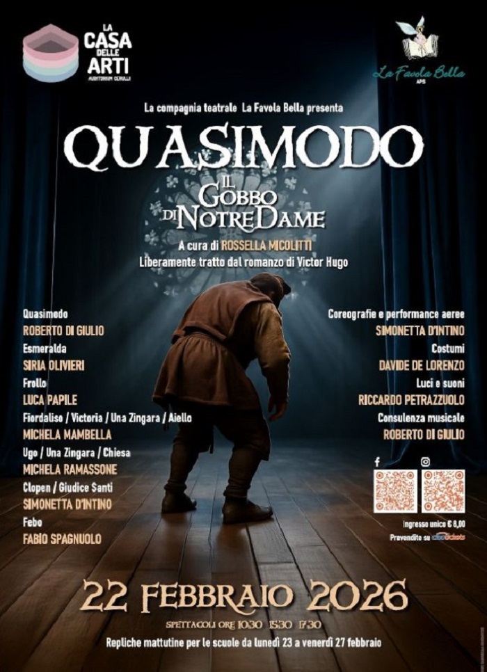 “Quasimodo, il gobbo di Notredame” spettacolo liberamente tratto dal romanzo di Victor Hugo. Domenica 22 febbraio, la compagnia teatrale “La Favola Bella” porterà in scena all’Auditorium Cerulli, la Casa delle Arti, in anteprima assoluta, lo spettacolo “Quasimodo, il Gobbo di Notredame”