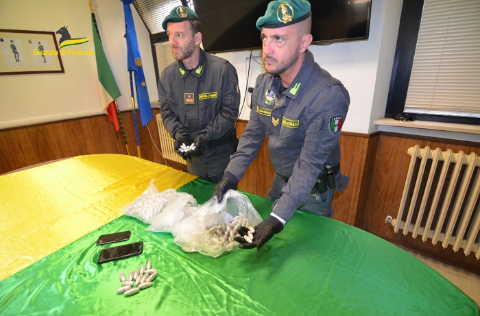Nell’ambito del piano d’azione “DRUG MARKET” sono stati intensificati i controlli effettuati alle principali vie di accesso della città adriatica, in particolare in prossimità degli ingressi autostradali, degli spazi aeroportuali e delle stazioni ferroviarie. Grazie a questa capillare attività ispettiva, i “baschi verdi” del Comando Provinciale di Pescara, durante un pattugliamento del territorio, nei pressi della stazione di Pescara centrale, hanno proceduto al fermo di un giovane immigrato appena arrivato in città. L’extracomunitario ha attirato l’attenzione dei finanzieri per l’atteggiamento equivoco e sospetto assunto alla vista degli operatori di polizia e difatti dall’immediato controllo del voluminoso bagaglio che aveva al seguito, è stato possibile rinvenire 4 buste di cellophane con all’interno 426 ovuli di marijuana e 2 smartphone, il tutto sottoposto a sequestro. La sostanza stupefacente avrebbe consentito il confezionamento di circa 9.000 spinelli da smerciare sulla piazza pescarese, per un valore sul mercato dello spaccio di circa 50.000 euro. Il giovane è stato quindi accompagnato presso gli uffici della caserma per procedere ai rilievi fotosegnaletici, in quanto sprovvisto di documenti di riconoscimento. Dagli accertamenti esperiti al sistema informativo del Corpo, lo stesso è risultato gravato da numerosi precedenti di polizia sempre nel settore stupefacenti. Il giovane straniero é inoltre senza fissa dimora ed è già stato colpito da 2 provvedimenti di rintraccio ed interdizione dal dimorare nel comune di Firenze, dove invece vive. Infine, come disposto dall’A.G. competente, i finanzieri conducevano il fermato presso la locale Casa Circondariale