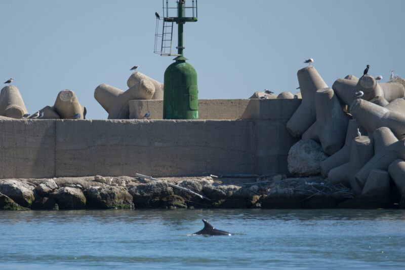 Ieri mattina le osservazioni dei tanti uccelli che correvano sulla battigia sono state distratte però dalla inconsueta osservazione di due delfini che nuotavano all’ interno del Porto. Dalle foto, scattate dall’ esperto Marco Sborgia, è stato possibile facilmente identificarne la specie, si tratta di due Tursiopi adulti sicuramente in attività di ricerca e cattura di pesci.